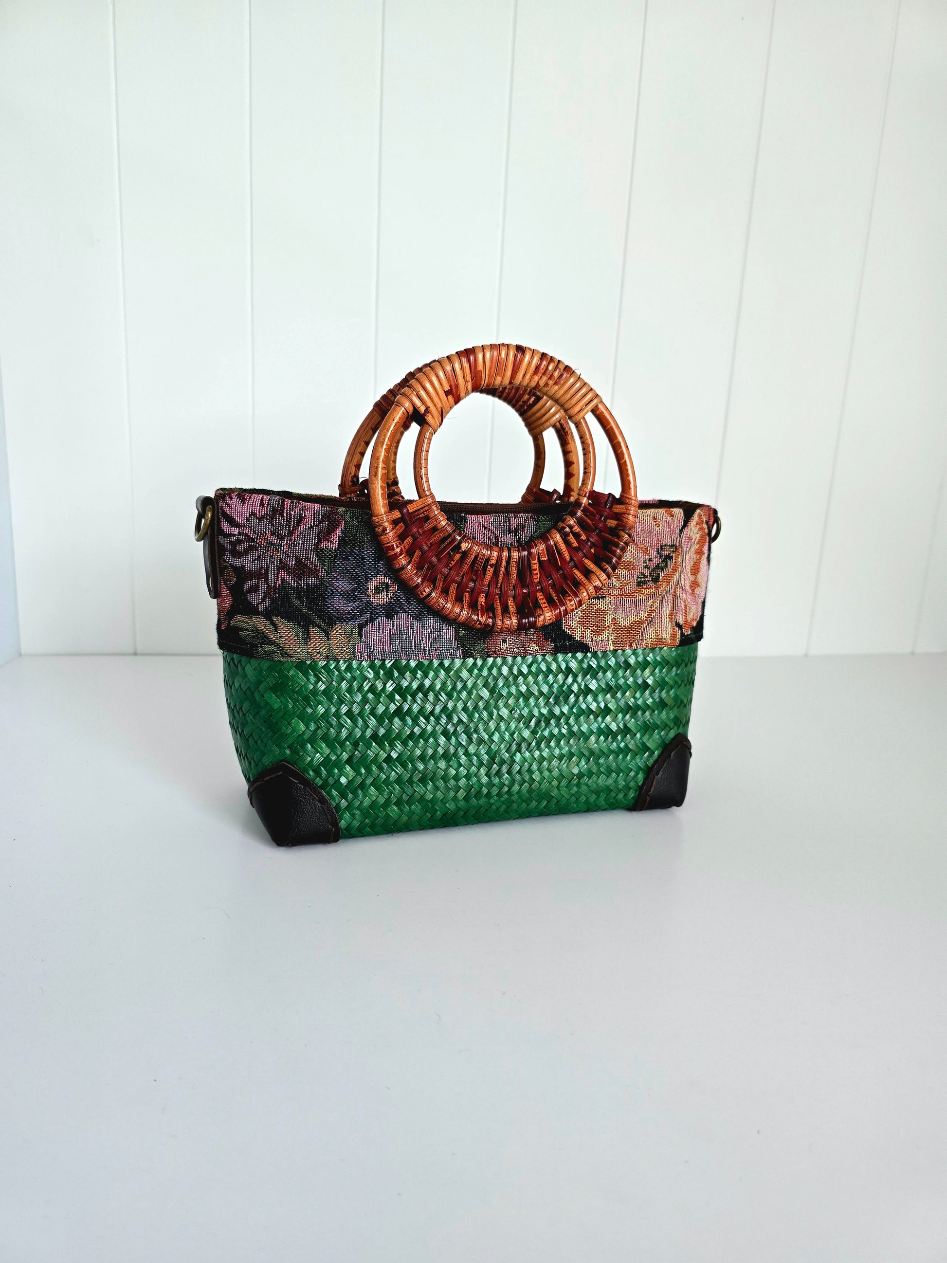 Blossom into style with the Chada Bag, in the richness of emerald green. A beautifully crafted compact handbag that blends intricate woven grass with the charm of floral fabric. This eco-friendly bag is the perfect combination of practicality and elegance.