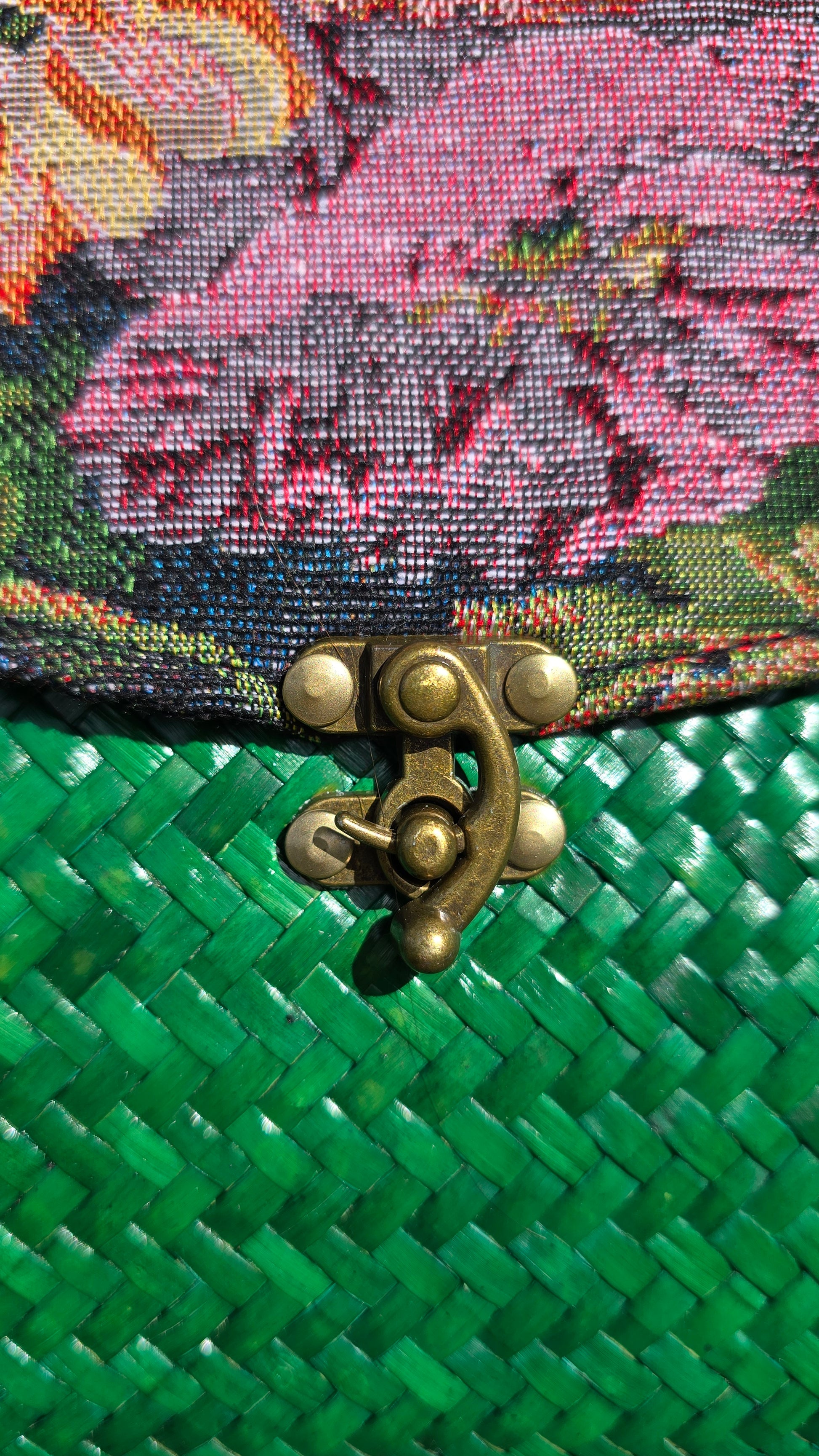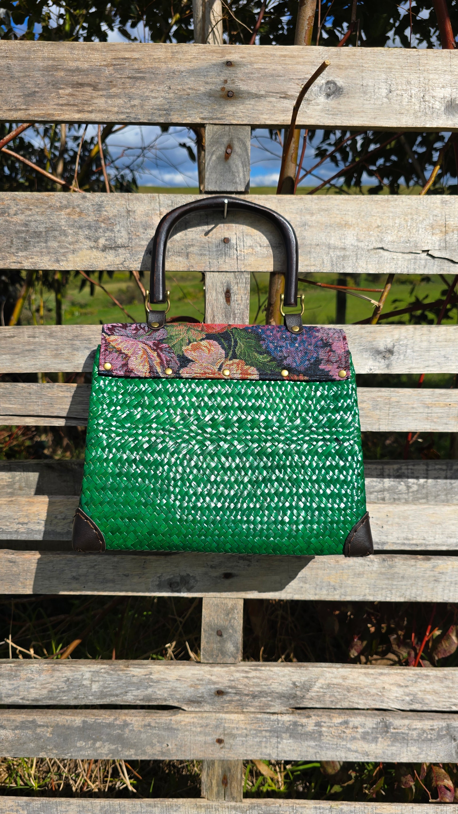 Meet Pavinee, the mama of the emerald green range. This stunning handbag combines floral tapestry with gorgeous green-dyed straw, creating a piece that is both elegant and eco-friendly. Its natural, handcrafted charm is balanced by modern functionality, making it the perfect addition to your collection.