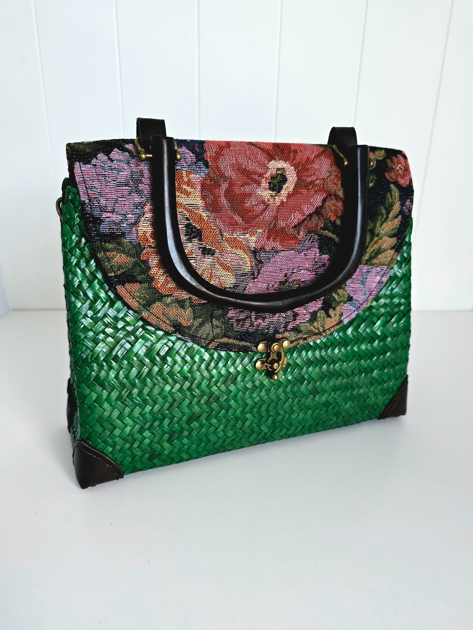 Handwoven grass, floral tapestry, cotton lining, faux leather and mango wooden handle